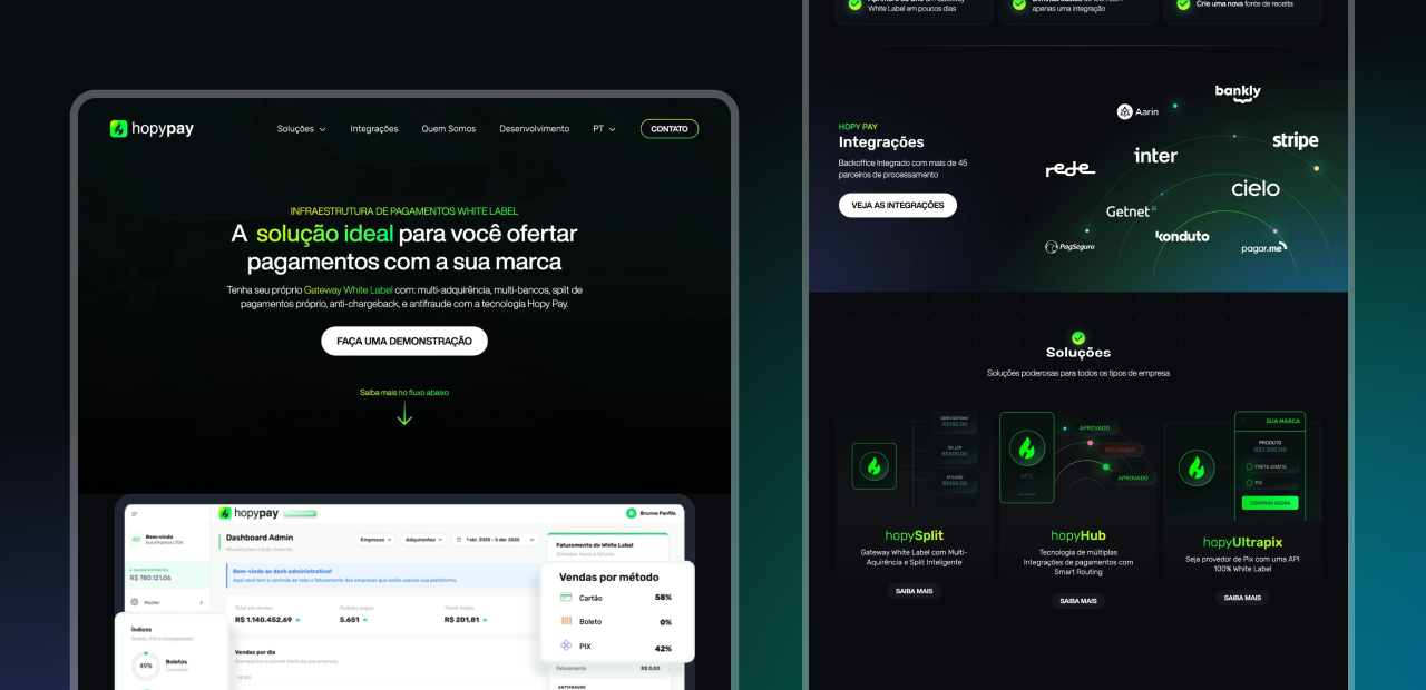 A Hopy Pay é uma infraestrutura de pagamentos White Label que permite empresas ofertarem soluções financeiras com a sua própria marca — da API ao gateway, passando por split de pagamentos, antifraude e múltiplos métodos de cobrança. O desafio era comunicar toda essa complexidade técnica de forma clara e confiante para dois públicos distintos: desenvolvedores que precisam de documentação e integração, e tomadores de decisão que precisam entender o valor de negócio. Em um mercado dominado por fintechs com identidades fortes, a Hopy Pay precisava de uma presença digital que transmitisse robustez, escala e confiança — sem sacrificar a clareza.